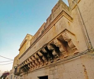 omen resulting from a malevolent look. One of the most characteristic examples is the “Loggia degli Sberleffi”, located in Giuliano di Lecce, built in 1609 on 15 corbels representing different figures that mock, precisely, the evil spirits that would like to disturb the domestic peace, thus driving them away with their grimaces, tongues and long faces. Some of the figures have an appearance that borders on the grotesque, elf ears, drooping cheeks, enormous moustaches. Others are extremely nice. They certainly represent different moments in a man's life, from faces that range from youth to old age, an aspect also highlighted by the camouflage and facial features.