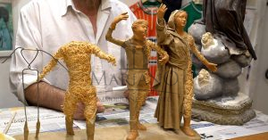 Creating a papier-mâché statue is a meticulous process that begins with shaping the support structure, made by wrapping straw in twine to form the sculpture's core. Hands, feet, and the face are sculpted separately in terracotta and then